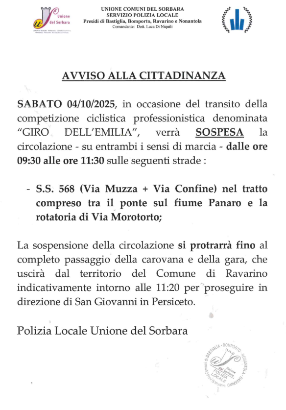 SABATO 04/10/2025, in occasione del transito della competizione ciclistica professionistica denominata "GIRO DELL'EMILIA", verrà SOSPESA la circolazione - su entrambi i sensi di marcia - dalle ore 09:30 alle ore 11:30 sulle seguenti strade : S.S. 568 (Via Muzza + Via Confine) nel tratto compreso tra il ponte sul fiume Panaro e la rotatoria di Via Morotorto;
