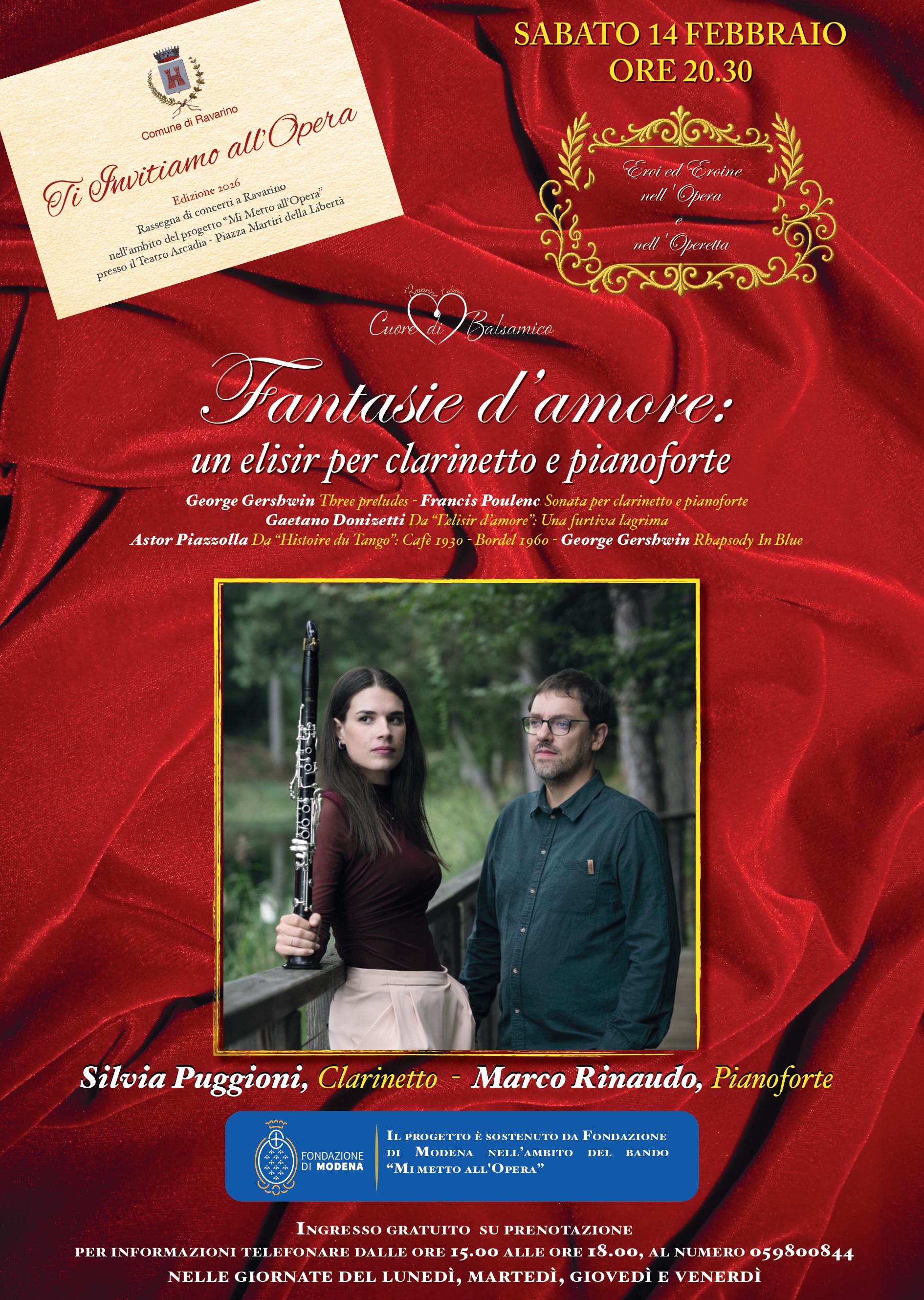 Protagonisti della serata saranno il talento di Silvia Puggioni al clarinetto e Marco Rinaudo al pianoforte, che ci accompagneranno nel programma "Fantasie d’amore: un elisir per clarinetto e pianoforte".