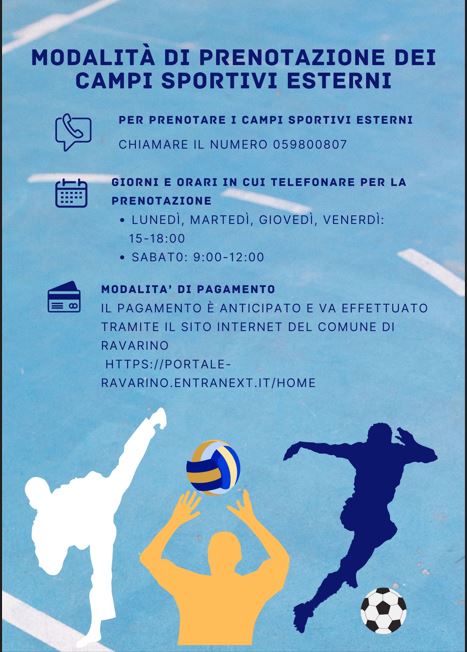 Per utilizzare i campi sportivi esterni occorre prenotare chiamando il numero 059/800807 il lunedì, martedì, giovedì e venerdì dalle 15 alle 18 e il sabato mattina dalle 9 alle 12